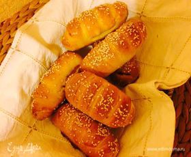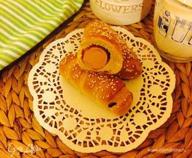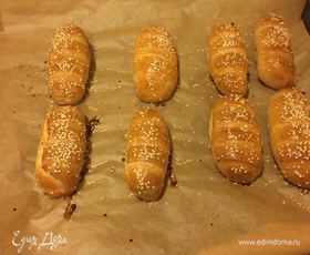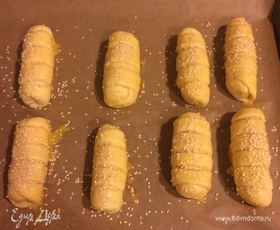 Булочки выложить на противень. Желток смешать с молоком. Смазать булочки и посыпать кунжутом.