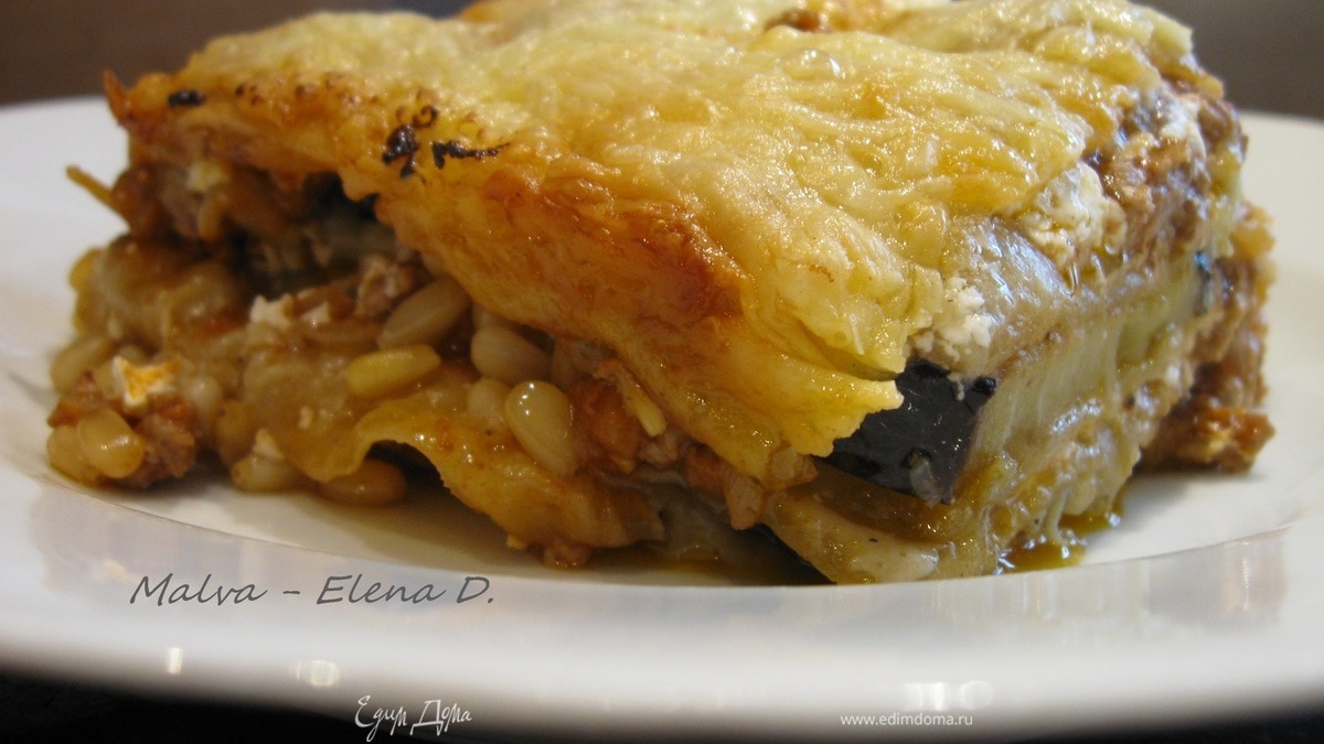 Хочу предложить вам рецепт очень вкусного, пикантного слоеного пирога. Думаю, что он вам понравится. Здесь идеальное, на мой взгляд, сочетание: баклажаны, ягнятина, кедровые орехи, дополнено слоями тонко раскатанного слоеного теста. Йогурт придает блюду нежность, а расплавленный сыр создает ароматную корочку. Ее можно есть и горячей, и холодной. Мне больше нравится горячий вариант. Если же вы хотите увидеть в баклаве более четкие слои, оставьте ее в холодильнике до следующего дня. Однако у меня в доме баклава обычно не доживает до следующего дня.