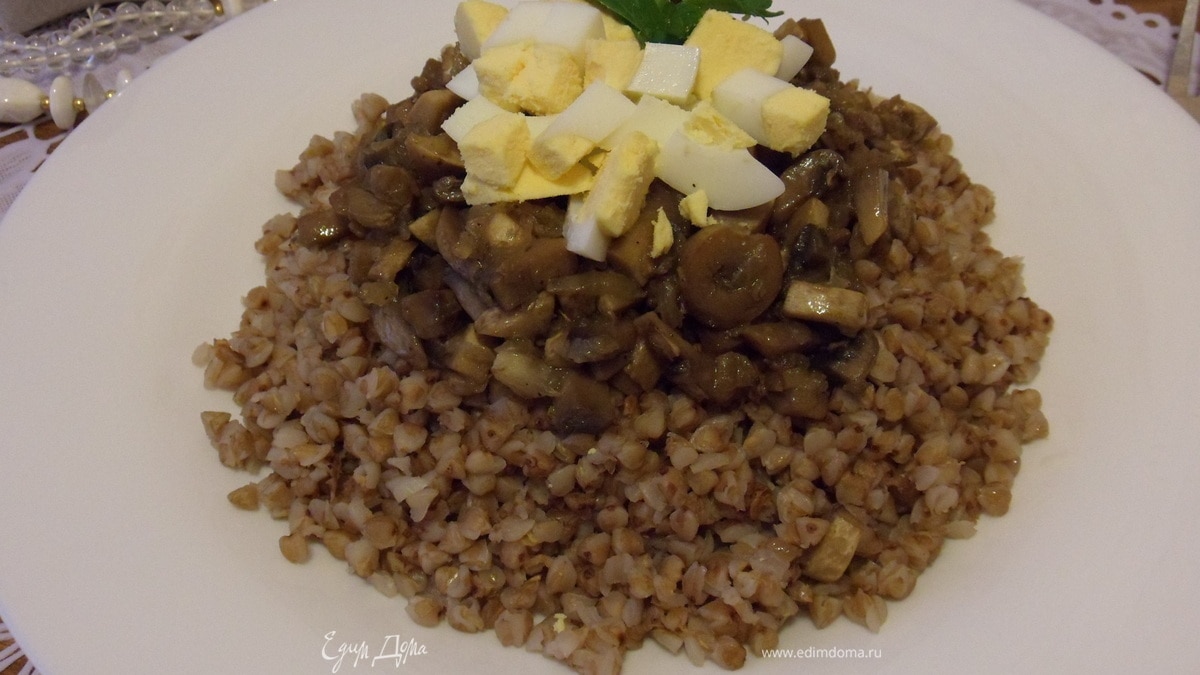 И так, ароматная гречневая каша с классической заправкой из грибов, лука и вареных яиц.
