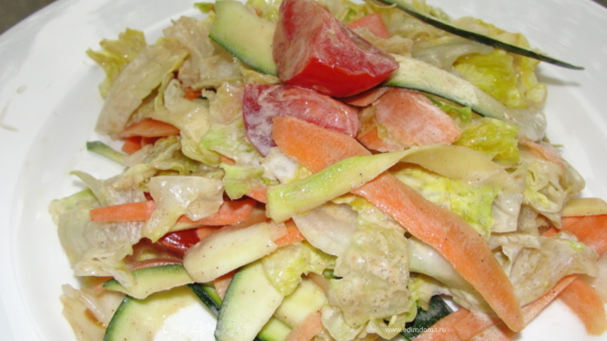 - Шаг 1Листья салата вымыть, высушить и порвать руками, так как иначе от ножа они могут потемнеть. Помидорки черри порезать на дольки. Морковь почистить и ножом для чистки картошки порезать на длинные полоски. Помыть цукини и так же порезать тем самым способом, но сердцевину оставить, она нам не нужна.Смешать помидорки, листья салата, морковь, цукини и кукурузу. Из олив. масла, уксуса, майонеза сделать заправку и полить ею салат. Посолить, поперчить и приятного аппетита.
