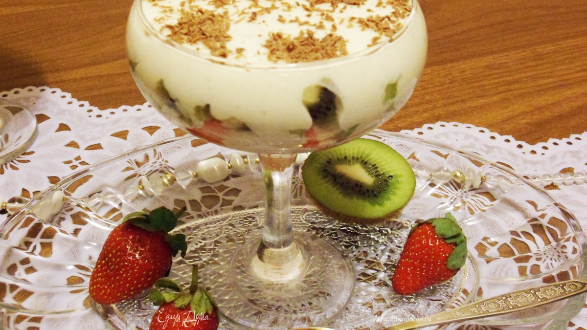 Простой и наивкуснейший десерт из сочных фруктов и приятного слегка густоватого крема на основе сливок от «Углече Поле». К сладкому воздушному крему я специально подобрала несладкие фрукты: клубнику и киви. Вот такой нежный, кисло-сладкий десерт.