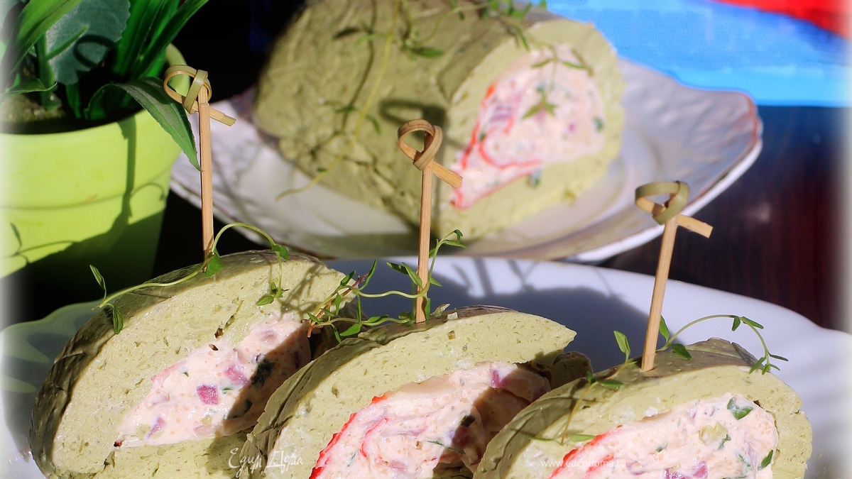 Одну палочку свернуть, ее положить на вторую, смазанную начинкой палочку и свернуть рулетом.
