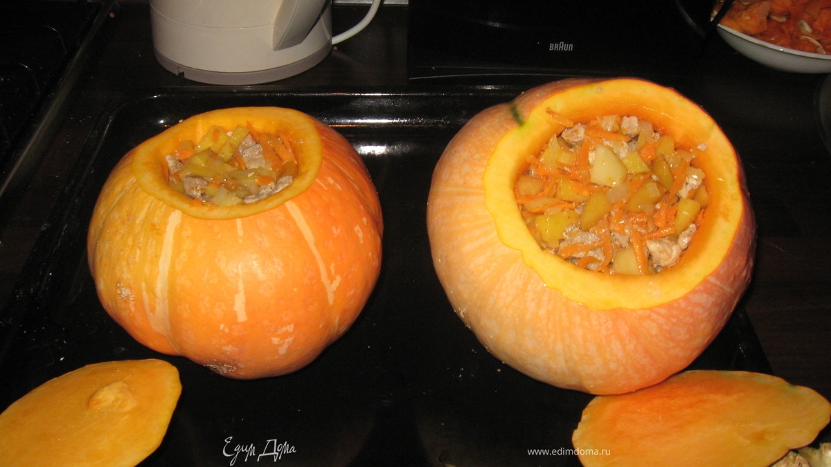 - Шаг 1Срезать верхушку тыквы в виде крышечки. Удалить семена. Срезать мякоть, она пригодится для наполнения.Свинину нарезать на маленькие кусочки, потушить, добавив соль, молотый перец. Лук и морковь обжарить на оливковом масле. Мякоть тыквы нарезать кубиками и припустить на сковороде с луком и морковью, слегка посолить. Все ингредиенты перемешать,сбрызнуть водой и сложить в тыкву. Закрыть крышечкой и запекать в духовке 1,5 часа.В противень, необходимо налить немного воды. Приятного аппетита!