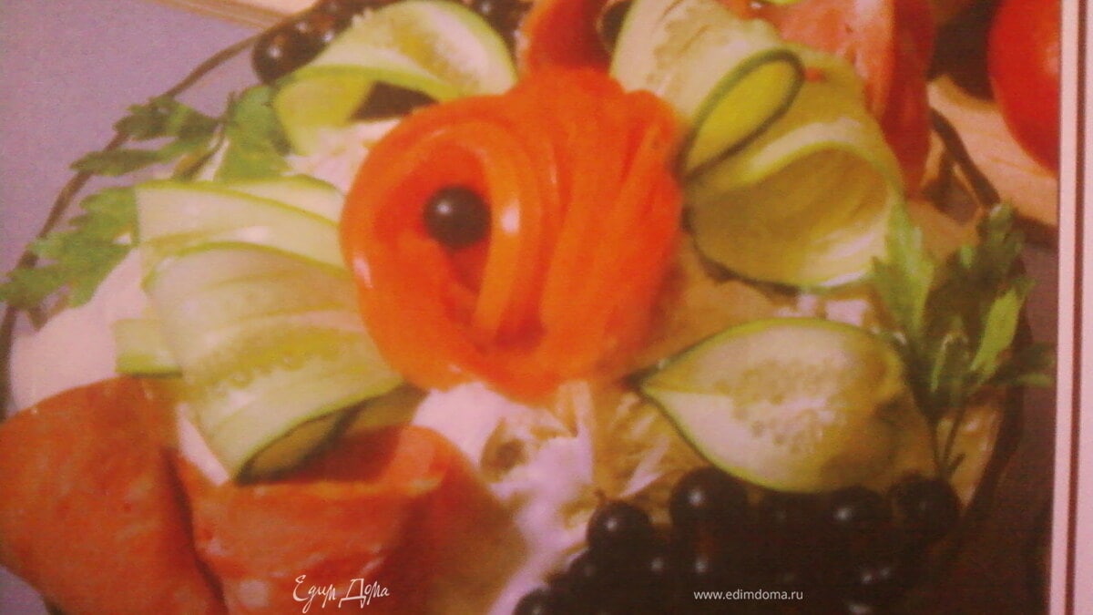 - Шаг 1Яблоко очистить от кожуры, удалить сердцевину. Картофель отварить, охладить, очистить. Часть ветчины, яблоко, картофель, огурец, капусту нарезать соломкой, помидоры - кружочками. Все продукты уложить в салатницу, полить майонезом. Украсить ломтиками ветчины, помидорами, огурцами, зеленью и ягодами.