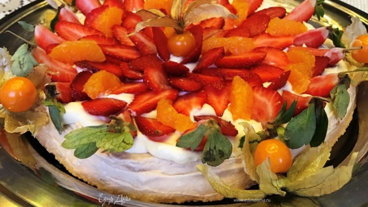 На остывшую основу-безе выложить крем, распределить его по всей поверхности. Сверху разложить ягоды и дольки мандаринов. Украсить можно плодами физалиса. Получается очень празднично!