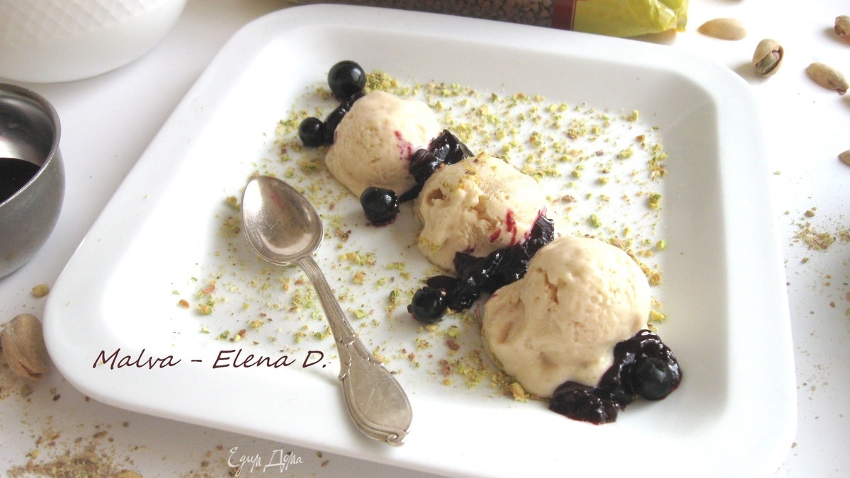 Подавать порционно, предварительно подержав мороженое 10 — 15 минут при комнатной температуре, украсив ягодами, желе и измельченными фисташками. Приятного аппетита!