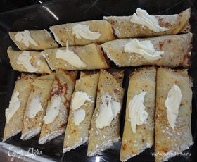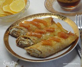 Начинку намазываем на каждый блинчик, сворачиваем рулетиком и разрезаем на две части.