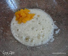 Я приготовила пюре из замороженной тыквы, поставив на разморозку на 5 минут в микроволновку. Затем протерла через сито и добавила к яйцам, взбитым с сахаром и солью.