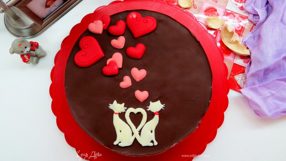 Для глазури нужно растопить шоколад (я брала горький, 78% какао) и 50 г сливочного масла. Я обычно делаю это в микроволновке. Перемешать, должна получиться жидкая глазурь и вылить ее на суфле, вращая форму, чтобы глазурь распределилась равномерно. Все, торт «Птичье молоко» желательно подержать полчасика в холодильнике и можно подавать! Украсить можно по желанию. У меня в честь праздника парочка влюбленных котов и сердечки из шоколада. Сердечки сделаны с помощью молда из окрашенного в красный цвет шоколада, а котиков обвела растопленным шоколадом по трафарету, после застывания шоколада переложила фигурку на торт. - Шаг 6