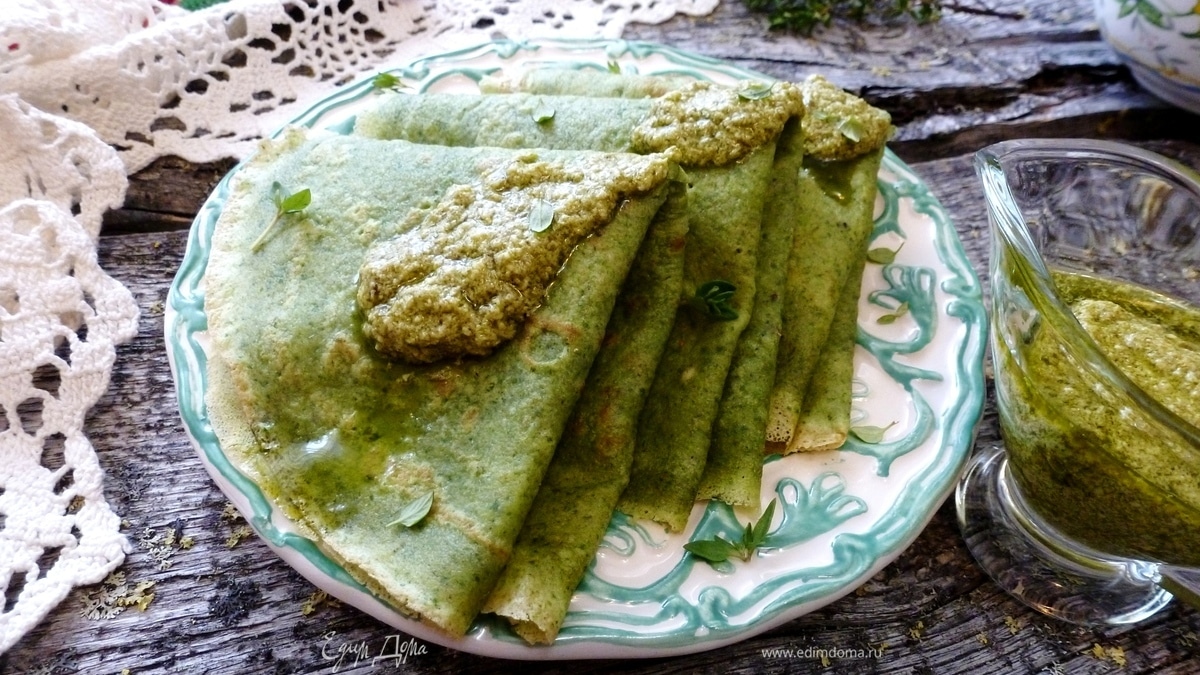 Мясная начинка и вкусный соус песто делают их прекрасной сытной закуской или полноценным ужином. Ряженка придает блинчикам приятную кислинку, со шпинатом и овсяной мукой получилось очень органично.