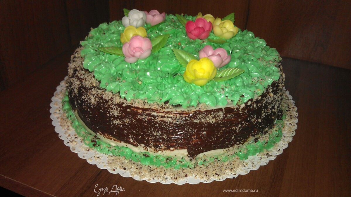 На дно разъемной формы выложить пропитанный корж и залить готовым сливочным кремом. Поставить застывать в холодильник на 1 — 1,5 часа. После накрыть второй частью бисквита. В качестве украшения я использовал крем масляный классический на сахарной пудре. Для его приготовления понадобится сливочное масло (комнатной температуры) и сахарная пудра. В процессе взбивания добавил пару капель зеленого пищевого красителя. Окружность торта — это шоколадный ганаш и тертый грецкий орех. - Шаг 12