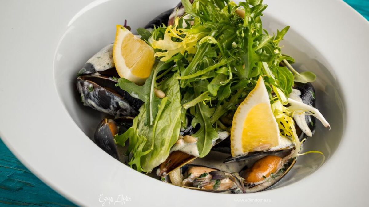 Выкладываем в тарелку мидии, поливаем соусом. Украшаем салатом и кусочком лимона. Аппетитное и легкое в приготовлении блюдо готово!