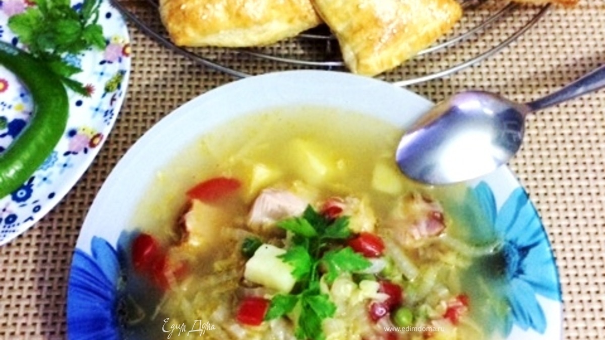 Еще вариант вкусного супа к обеду. Копченая свиная грудинка в сочетании с куриным бульоном, нежной пекинской капустой, зеленый горошек и немного красного болгарского перца — получается красочная тарелочка. Угощайтесь, это вкусно!