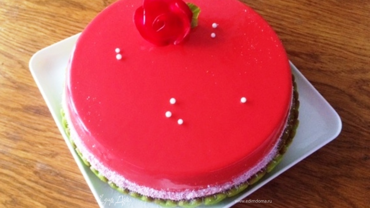 Пока тесто охлаждается, приготовим зеркальную глазурь, тем более, ее необходимо приготовить за сутки до покрытия торта. Зеркальную глазурь готовила аналогичную, как в рецепте (см. ссылку), только с белым шоколадом и подкрашивала красным красителем. ссылка на рецепт Накрыть глазурь пищевой пленкой в контакт и отправить в холодильник до покрытия торта. - Шаг 4