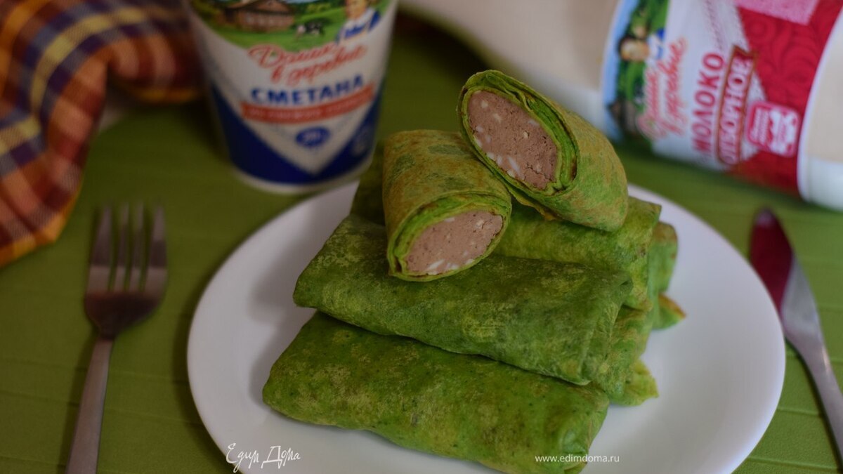 Приготовить начинку. Лук обжарить на растительном масле. Добавить печень и жарить до готовности. Печень с луком измельчить в блендере, добавить натертые на терке яйца. перемешать. Начинку завернуть в блинчик. - Шаг 6