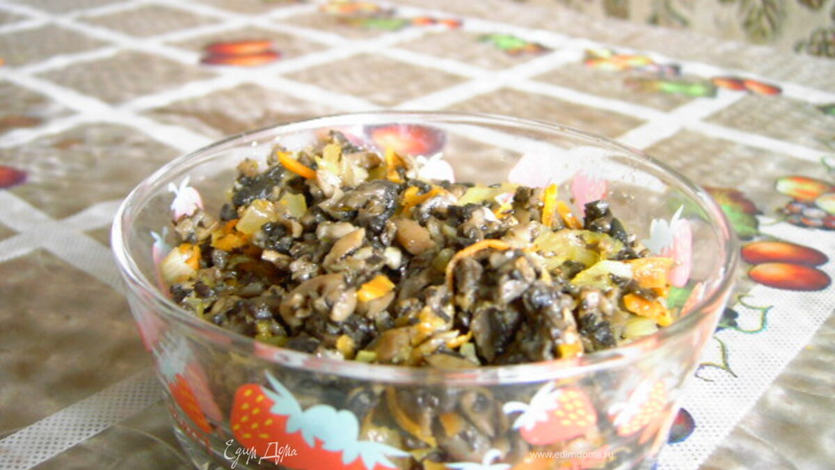 - ПодготовкаШампиньоны хорошо промыть,крупно порезать и обжарить на сковороде 20-25мин(до испарения жидкости),посолить,поперчить.Остудить,затем перекрутить на мясорубке.Полученную массу выложить в дуршлаг,чтобы стекла оставшаяся жидкость.Разогреть на сковороде 3ст.ложки масла и обжарить лук,нарезанный полукольцами,и морковь,нашинкованную на крупной тёрке.Смешать овощи с грибами,добавить чеснок,пропущенный через пресс и всё хорошо перемешать.