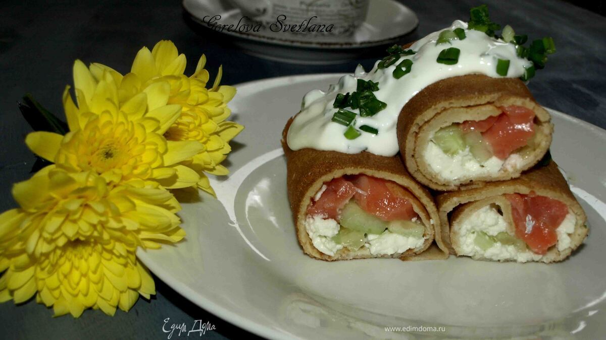 Блины с деревенским сыром, форелью и огурцами