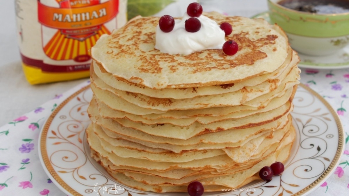 Блины с манной крупой получаются пышными, с крупными дырочками с одной стороны, их можно подать с медом, вареньем или сметаной.