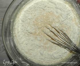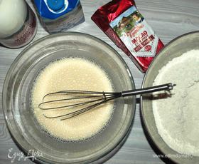 Соединить муку с полученной смесью. Взбить, чтоб не было комочков. Белки взбить в некрепкую пену.