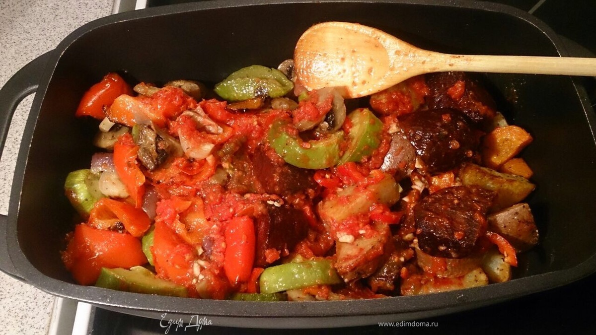 Ну вот и начался Великий пост. Хочу поблагодарить всех ЕдимДомовских девушек за огромное количество вкусных, красивых и аппетитных рецептов блинов на масленичной недели! Много для себя подчеркнул новых рецептов! А теперь можно и попоститься, поэтому и решил приготовить для вас вот такое простое, но очень вкусное печеное овощное рагу. Крупно рубленые картофель, свекла, морковь, болгарский перец, кабачки, шампиньоны, томаты в собственном соку, чили, немного зеленого ткемали, чеснок и свежая кинза создали прекрасное сочетание вкусов. Совсем несложно, довольно быстро, очень вкусно и полезно! Итак, приступим.