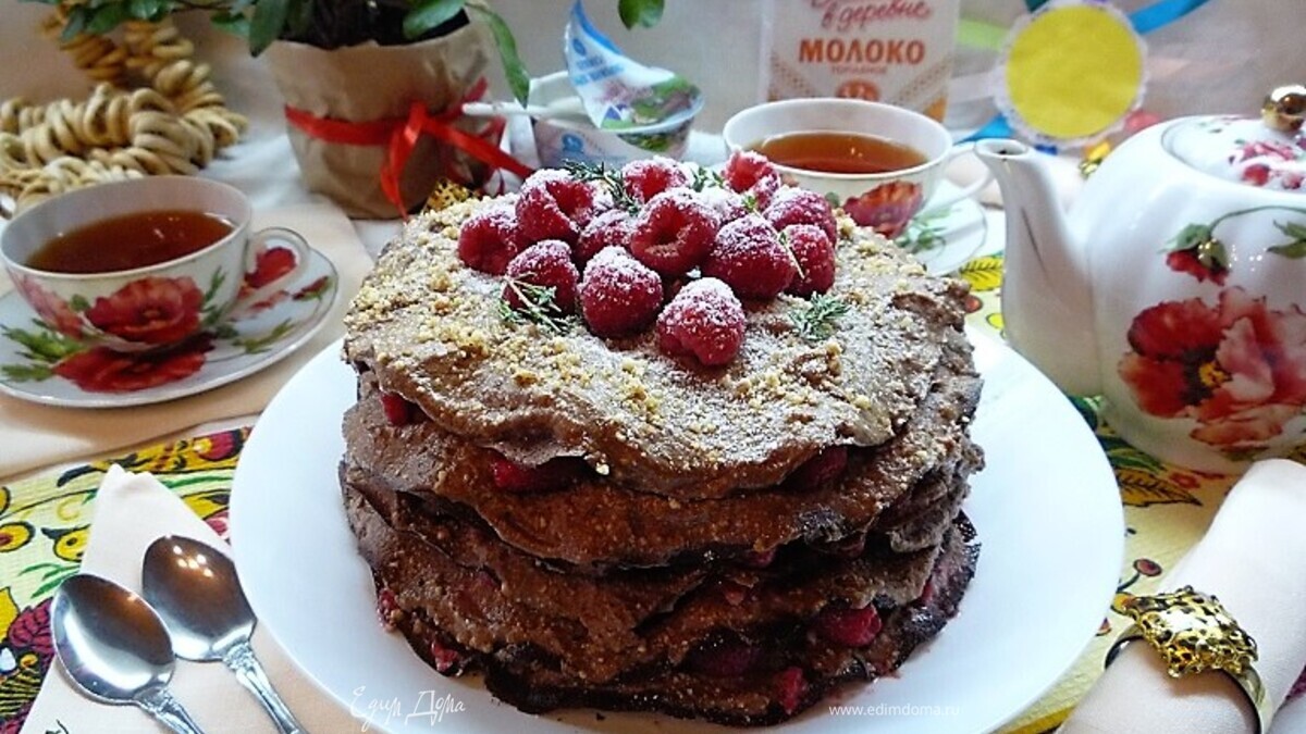 Шоколадные блины с нежным творожным кремом, малиной и миндальной крошкой —