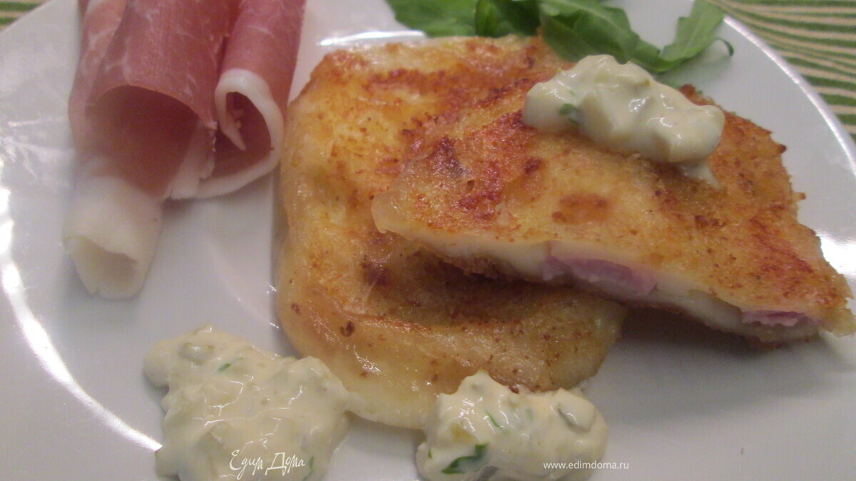 В кусках сыра осторожно сделать «кармашек» — разрез в середине. Вложить в него ветчину. Можно дополнительно вложить кружочки варенного яйца, как было в оригинальном рецепте.