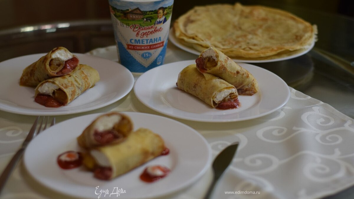 Завернутый блин с яблоками и творогом выложить на блин с клубникой. И заворачиваем рулет. - Шаг 18