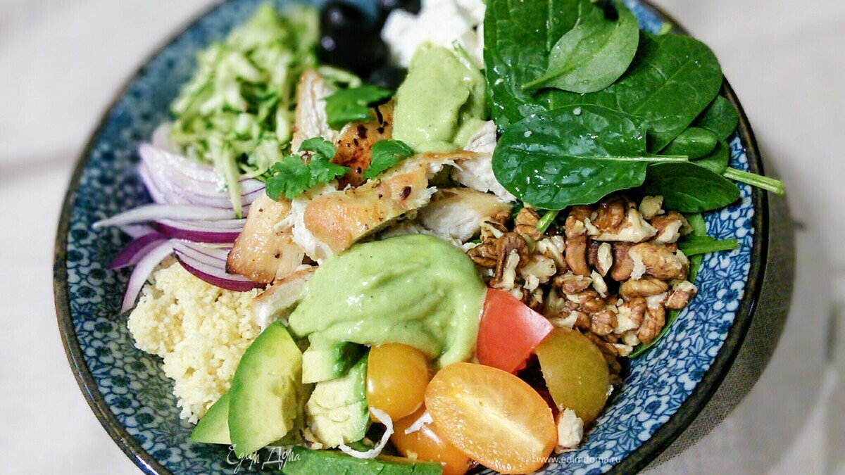 Power bowl — энергия в чаше, и к тому же очень вкусно! Как раз те витамины и микроэлементы, которых нам так не хватает в конце долгой зимы. Блюдо готовится за 35 минут, а если вы возьмете себе помощника, управитесь за 20. Я сомневалась и в категории блюда, и в его названии: вроде основное с мясом и гарниром, а может салат, но самодостаточный, сытный и питательный. В общем, решать вам, а мне готовить.