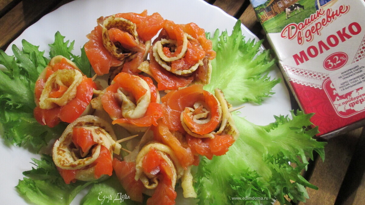 В каждый блин кладем кусочки лосося, сворачиваем пополам. Затем заворачиваем половинку блина с начинкой от внешнего края внутрь и скрепляем шпажкой.