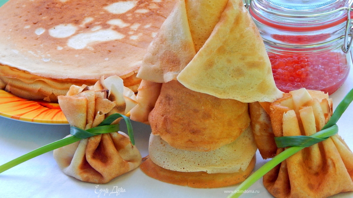 Так начался наш сегодняшний день. Блинчики на кефире получаются тоненькими, с дырочками, тающими во рту. Их можно подавать как фаршированными, так и со сметаной или ягодным соусом. Из части блинчиков я сделала мешочки с красной икоркой, а другую часть мы ели со сметанкой. Количество ингредиентов можно уменьшить вдвое.