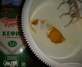 В посуду для взбивания влить кефир «Домик в деревне», добавить яйца, соль и сахар, перемешать.