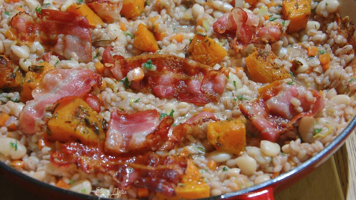 Эту кашу можно назвать модным сейчас словом «перлотто» — жидкость здесь добавляется в крупу не вся сразу, а понемногу, как в итальянском ризотто. Бульон лучше использовать куриный или овощной, вместо красного вина подойдет белое, а вместо бекона — копченый сулугуни. Тыкву перед запеканием можно полить бальзамическим уксусом или кленовым сиропом, специи и травки тоже можно использовать любые.