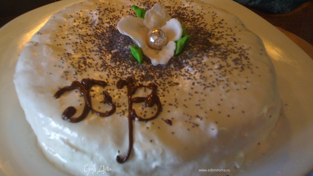 - Шаг 1Мак запарить, остудить, обсушить, измельчить в кофемолке. Имбирь мелко порубить. Смешать мак имбирь и муку. Желтки отделить от белков, желтки взбить с сахаром, белки с щепоткой соли отдельно. В желтки поочередно вводить маковую смесь и белки. Форму смазать сливочным маслом, выложить массу, запекать при температуре 175 гр. 40 минут. Тем временем, приготовить глазурь: Белки взбивать сначала на медленной, потом на максимальной скорости, постепенно вводя сахарную пудру 200 гр. и лимонный сок. Желатин растворить в воде, остудить. И когда белки будут иметь блестящую кремообразную консистенцию, тонкой струйкой ввести желатин, продолжая вымешивать. Корж вынуть остудить. Полностью остывший корж покрыть глазурью. Поверхность присыпать маком. Из неиспользованной глазури сформировать с помощью сахарной пудры лепестки, листья и украсить. Растопленным на водяной бане шоколадом нанести рисунок. Приятного чаепития.