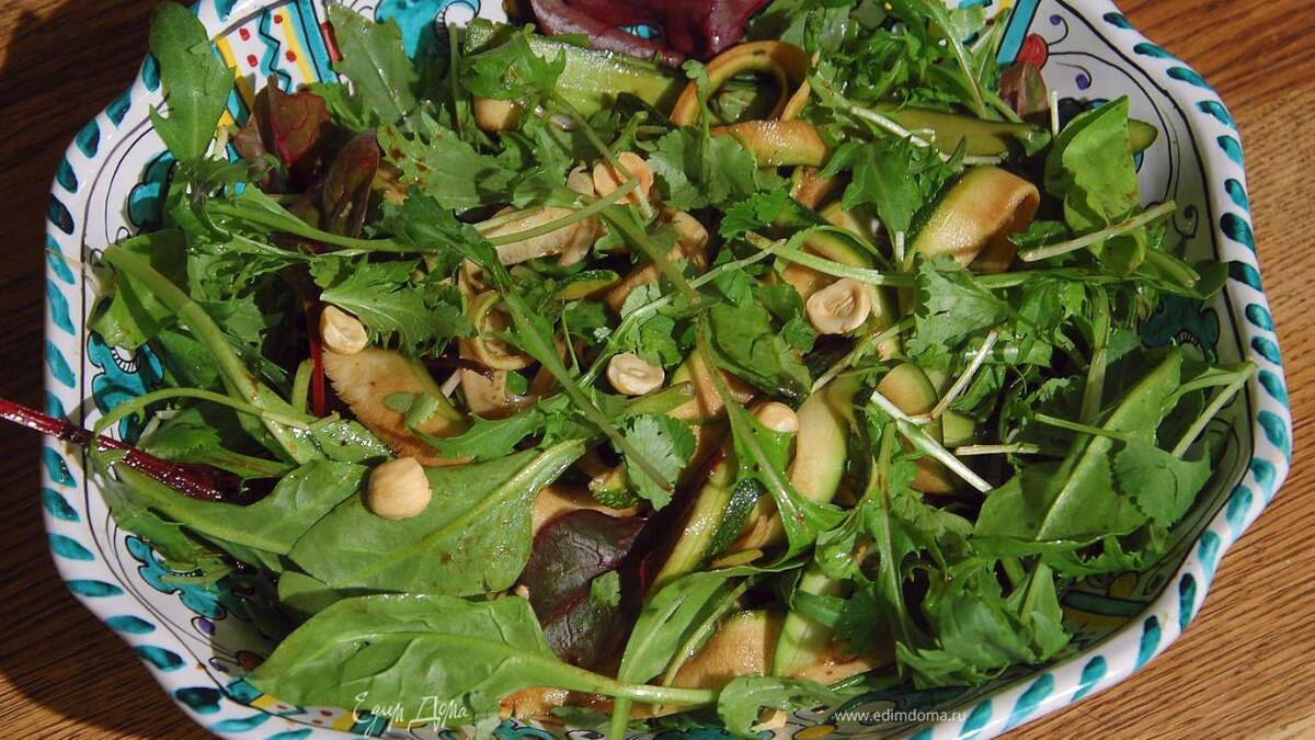 Главное здесь, конечно, фенхель — пока не появились настоящие, с грядки, помидоры и огурцы, он спасает все салаты! Цукини можно заменить кабачком, но он должен быть свежим, хрустящим. Вместо фундука подойдут подсушенные грецкие орехи, пекан и даже арахис, а если не любите кинзу, возьмите другую яркую травку — базилик или мяту. В маринад хорошо добавить немного горчицы или меда.
