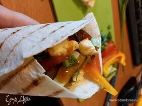 - Шаг 11. Сладкий перец вымыть, очистить от зерен и разделительных перегородок и нарезать тонкими полосками. Стручек чили вымыть, разрезать вдоль пополам и, удалив семена, нарезать тонкими полукольцами. Фасоль и кукурузу откинуть на дуршлак. 2. В сковороде разогреть масло. Около 10 мин обжаривать в нем чили с мясным фаршем. Добавить сладкий перец, кукурузу, фасоль и около 10 мин тушить на слабом огне под крышкой. Затем посолить и поперчить по вкусу. 3. По центру каждой пластины лаваша выложить горячую начинку, аккуратно скатать трубочкой (я с одной стороны его сложила).