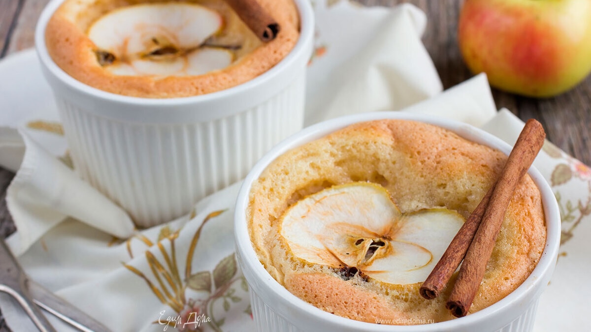 - Шаг 8Разложите тесто в формочки. Сверху положите тонкие слайсы яблок. Выпекайте при 200°С в течение 20 минут. Готовое суфле украсьте палочками корицы.
