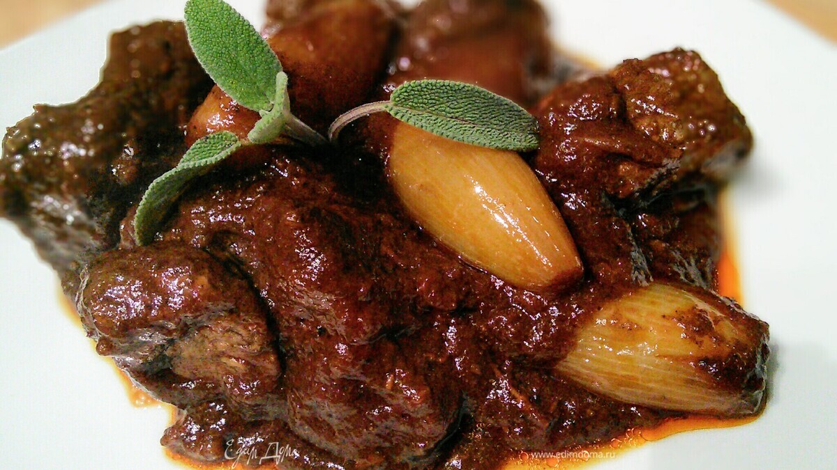 Размешать, довести до кипения, уменьшить огонь и тушить на маленьком огне под крышкой 30 минут, затем выложить луковички и тушить 1,5 часа до готовности мяса. Регулярно проверять, чтобы соус не подгорел. В конце проверить на соль, перец и добавить щепотку сахара. - Шаг 10
