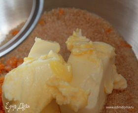 В глубокой посуде смешать коричневый сахар с апельсиновой цедрой. Добавить сливочное масло и взбить до кремообразной консистенции.