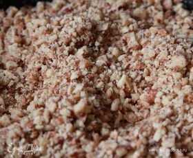На сухой сковороде, помешивая, обжарить молотые орехи до золотистого цвета. Обжарить рубленые орехи. Разогреть духовку до 175ºC (газовую до 200).