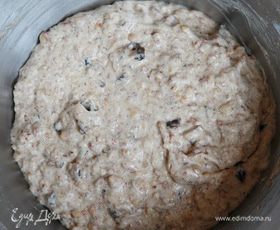 Добавить цукаты, изюм и рубленые орехи, перемешать. В два приема добавить смолотые орехи, смешанные с разрыхлителем. Тщательно перемешать широкой спатулой.