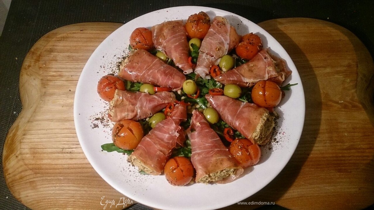 Вот захотелось приготовить и порадовать к приезду любимой из командировки, такую вот мясную закуску к вину! Прошутто конечно и само по себе вкусное кушанье, но вот решил добавить к нему еще такую вот начинку, прекрасное сочетание творожного сыра со сливочным хреном, вяленым инжиром, вялеными томатами и свежим базиликом оказалось очень вкусным и невероятно совместимым с холодным мясом. Свою изюменку, добавили печенные черри с оливками и чили. Итак, начнем готовить!