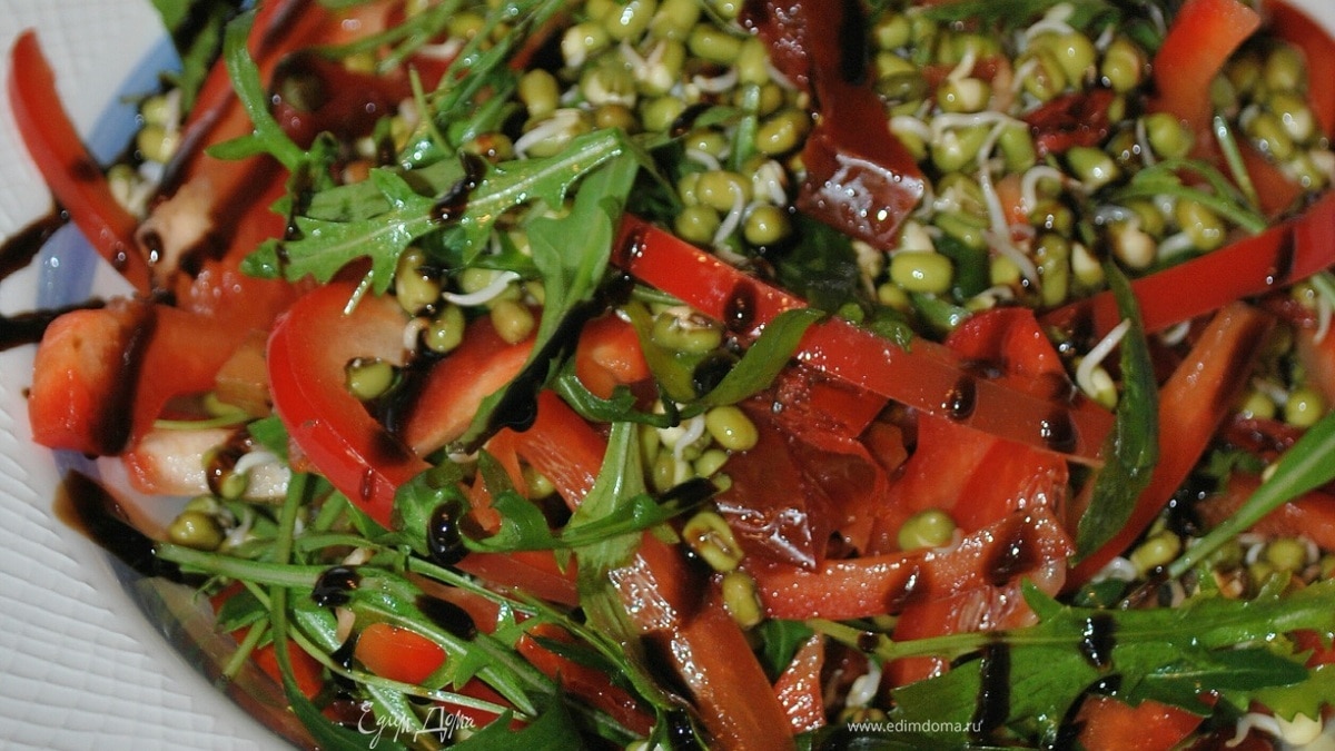В пророщенный маш добавляем болгарский перец, вяленые помидоры, пряную руколу. Салат я заправила маслом от вяленых помидоров, оно у меня очень ароматное с чесноком и базиликом.Солим и перчим по вкусу. Сверху салат я полила бальзамическим соусом.Если такого ароматного масла из-под вяленых помидоров нет, можно добавить по вкусу чеснок или ароматные травы по своему вкусу. Или сделать соус с чесноком, соевым соусом и медом. - Шаг 13