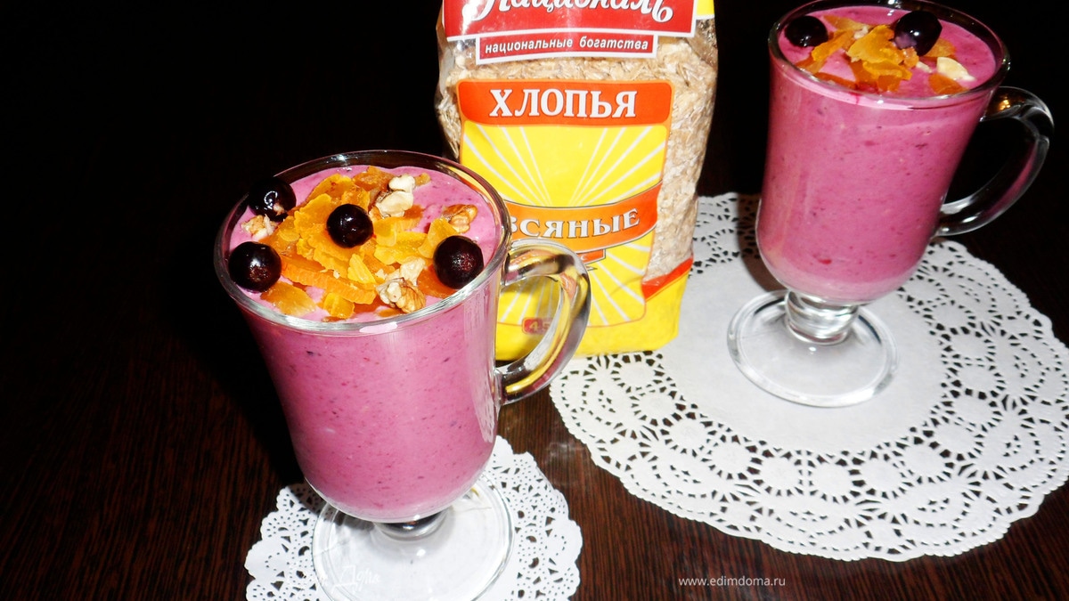 Смузи — сладкий густой напиток в виде смешанных в миксере (блендере) ягод, фруктов или овощей (обычно одного вида) с добавлением молока, сока, йогурта, минеральной воды. Основные составляющие смузи — свежие или замороженные ягоды, фрукты (у меня — замороженная смесь ягод собственного производства из клубники, вишни без косточек, черной и красной смородины). В качестве дополнительных составляющих может использоваться все, что угодно, — мед, пряности, сиропы, травяные смеси и т. д. (у меня — апельсиновый джем, овсяные хлопья ТМ «Националь», грецкие орехи, курага) и соевое молоко. Напиток получился густой, вкусный, витаминный, красивый. Смузи поможет разнообразить постный стол. Что еще немаловажно, готовиться он очень быстро!