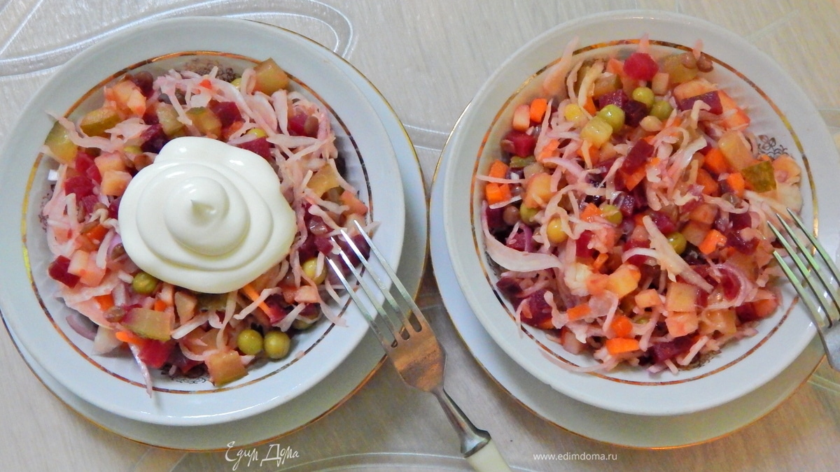Разложить винегрет по салатникам. Один салат заправить подсолнечным маслом (лучше ароматным), а другой майонезом. Я очень люблю винегрет с майонезом. Приятного аппетита!