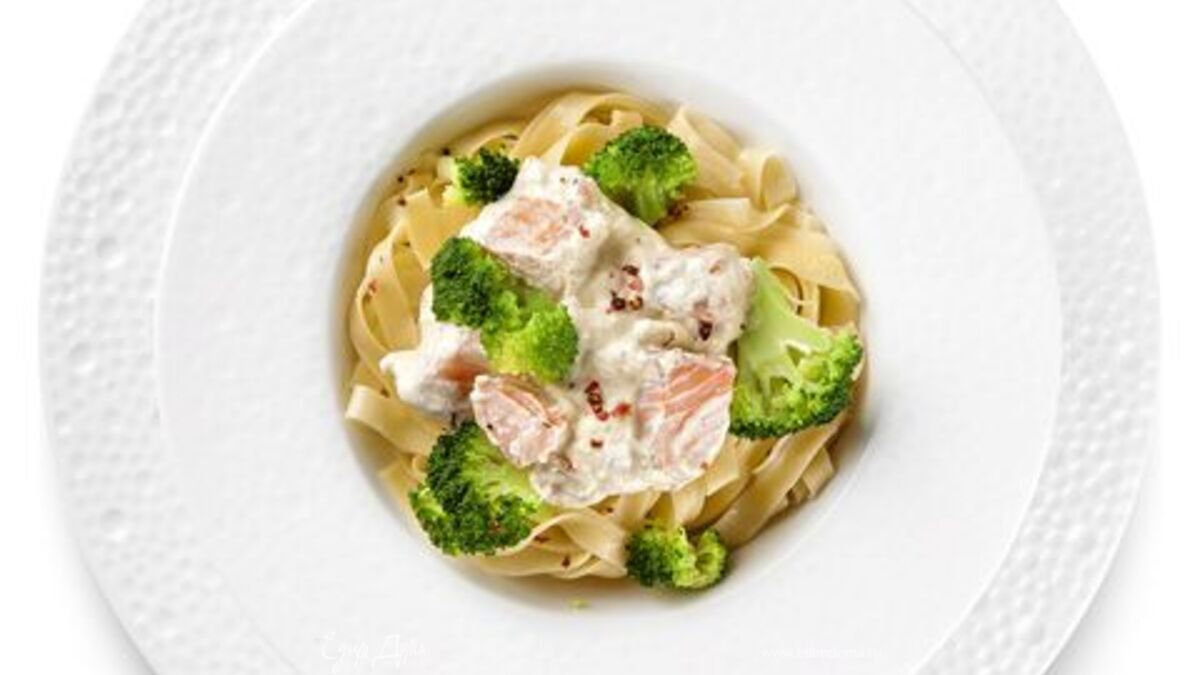 Нагрейте сковороду, налейте оливковое масло и слегка обжарьте лук и чеснок. Семгу порубите кусочками размером 2 см. Выложите семгу на сковороду и обжаривайте по 2 минуты с каждой стороны, добавьте сливки, аккуратно все перемешайте и дайте сливкам закипеть. Добавьте в соус специи, посолите, поперчите, добавьте нарезанную петрушку и, как только соус начнет снова закипать, снимите его с огня. Выложите в центр большой тарелки пасту, соцветия брокколи, залейте все соусом с семгой.