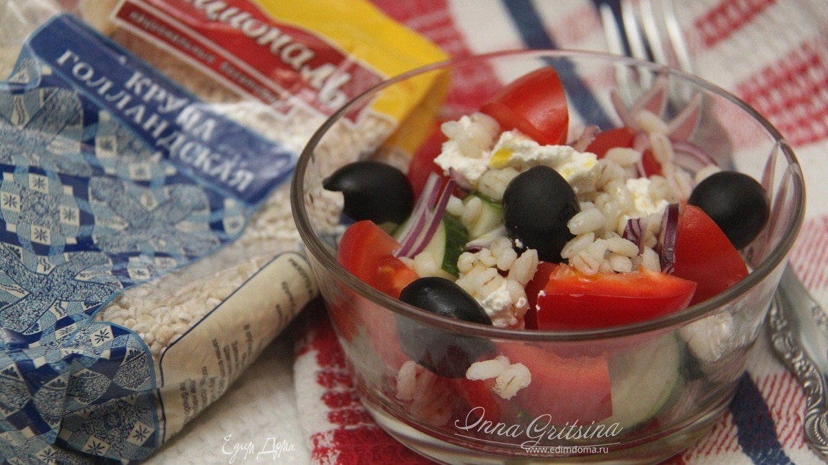 Овощи выложить в салатник, добавить лук, перловку, фету, маслины, заправить оливковым маслом, лимонным соком, посолить, добавить специи, перемешать. Греческий салат с русским акцентом, перловкой, готов! Салат съедать сразу (не для следующего дня!)