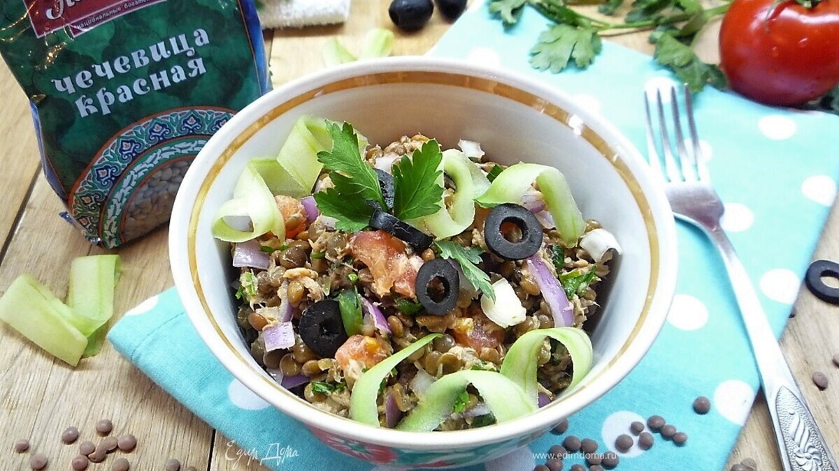 Вкусный и сытный салатик, не сложный в приготовлении, обязательно понравится любителям рыбных салатов. К тому же он богат витаминами и белком, который содержится в чечевице и тунце.