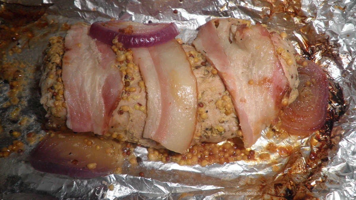 - Шаг 11. Мясо обмыть, обсушить. Натереть травами "Прованса", поперчить и залить лимонным соком (можно не полностью). Оставить мариноваться 40 мин. периодически переворачивая мясо. 2. Копченую грудинку нарезать тонкими полосками (примерно 10 полосок). Лук нарезать тонкими кольцами. Горчицы смешать и добавить 1 ч. л. растительного масла. 3. Когда мясо замаринуется, натрите его солью, кориандром, обмажьте со всех сторон смесью горчиц. 4. На противень выложите фольгу, слегка смажьте маслом, выложите кольца лука и 1 полоску копч. грудинки. Мясо выложите прям на кусочек грудинки вдоль, а лук по бокам. Сверху на мясо выложите кусочки грудинки. Заверните в фольгу и поставьте в духовку разогретую до 200 градусов. Выпекайте 30 мин. периодически поливая соком, который выделяется. Подавать с овощным салатом.