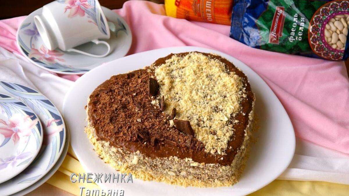 Не зря я выбрала именно этот торт в качестве «сердечного комплимента», торт получился ну очень вкусный! Корж из белой фасоли ТМ «Националь» по текстуре напоминает песочное тесто, при этом он получается сочный, не нуждающийся в пропитке. Что самое важное — фасоль в нем не угадывается вовсе. Понравился мне настолько, что я уверена, неоднократно буду теперь использовать этот рецепт коржа для других тортиков или пирожных.