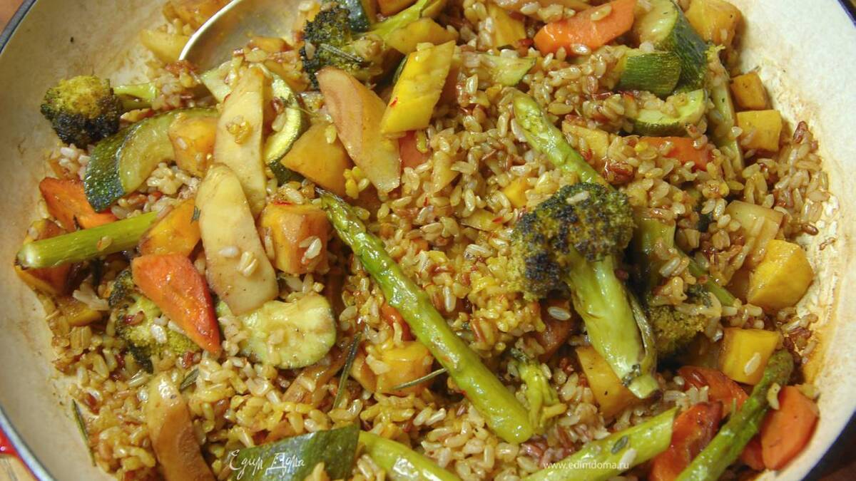 Обычно в паэлье гораздо больше деликатесных ингредиентов и много морепродуктов, а это такая вариация на тему паэльи. Неплохо добавить еще и корень сельдерея или петрушки. Овощи можно приготовить на пару, но при запекании на гриле вкус получается ярче, хорошо также сбрызнуть овощи кленовым сиропом, жидким медом или соевым соусом. Сделать такое блюдо можно заранее, а затем разложить в порционные пакеты и заморозить — это очень удобно, особенно в середине недели, когда нет времени.